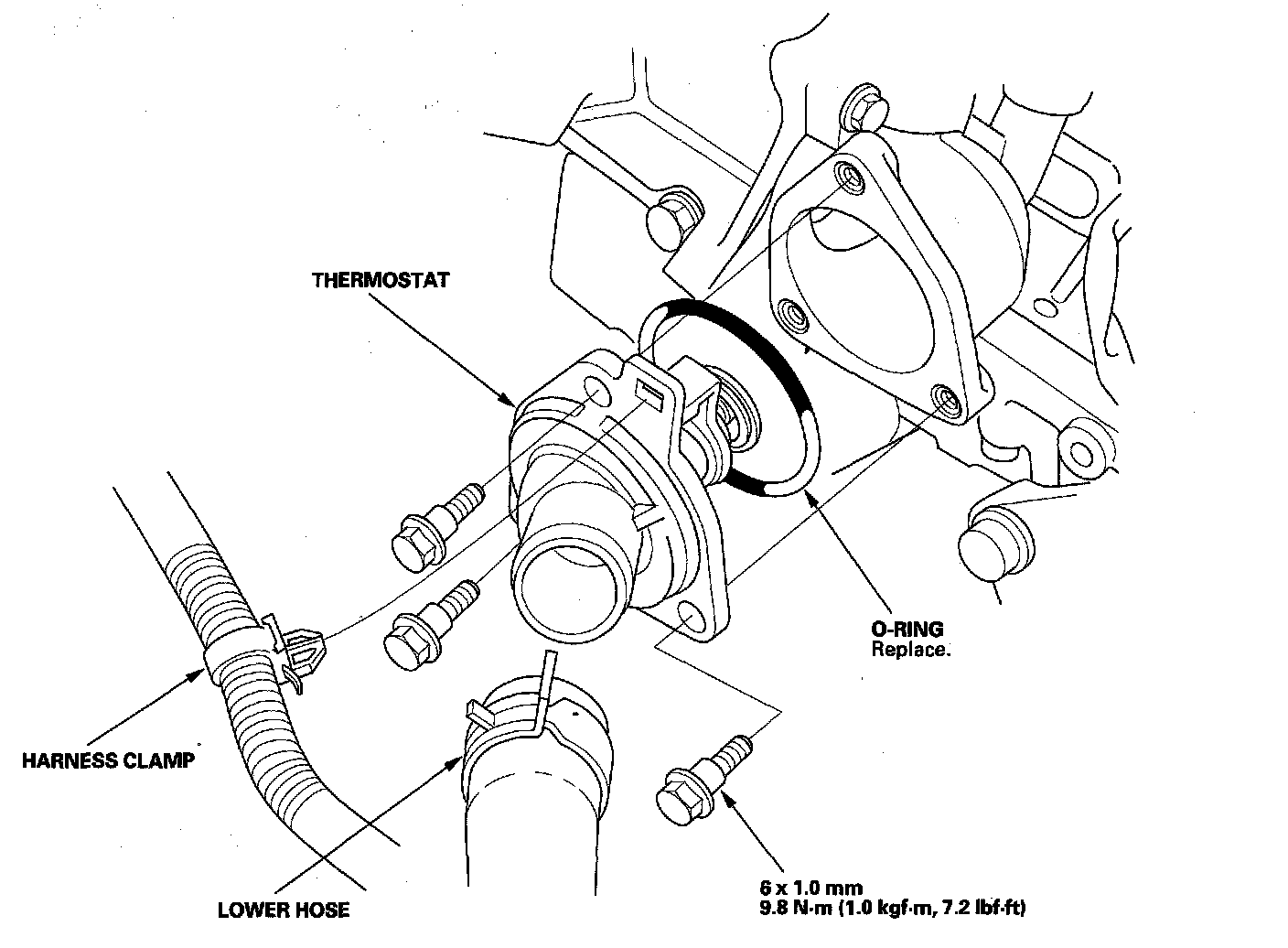 4. Install the thermostat with a new O-ring, then install the lower hose.