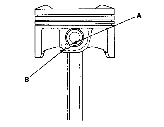 2. Apply new engine oil to the piston pin snap rings (A), and turn them in the ring grooves until the end gaps are lined up with the cutouts in the piston pin bores (B).