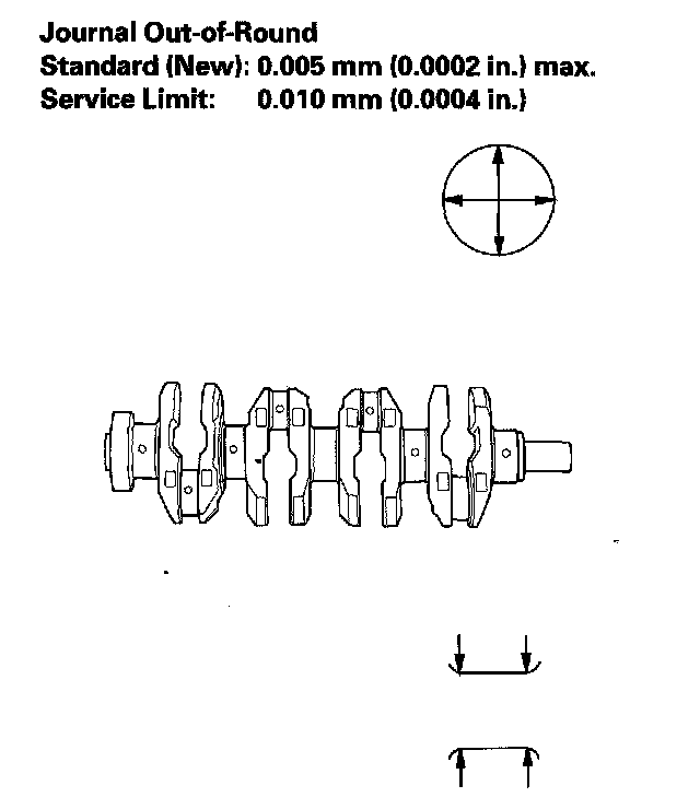 4. Measure the out-of-round at the middle of each rod and main journal in two places. The difference between measurements on each journal must not be more than the service limit.