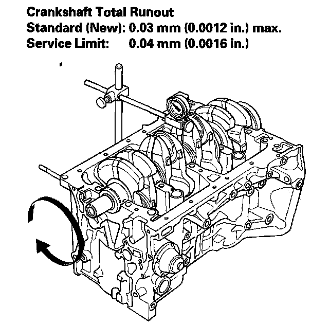 9. Measure runout on all main journals. Rotate the crankshaft two complete revolutions. The difference between measurements on each journal must not be more than the service limit.
