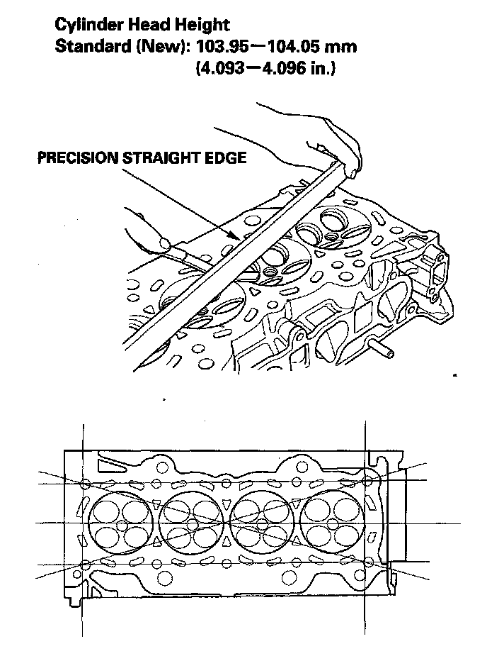 3. Check the cylinder head for warpage. Measure along the edges, and three-ways across the center.