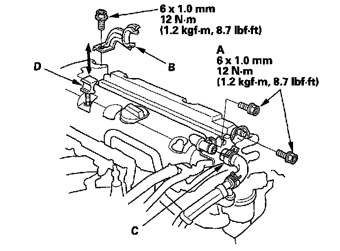 9. Install the power steering (P/S) hose clamp (B), breather hose (C), and the dipstick (D).