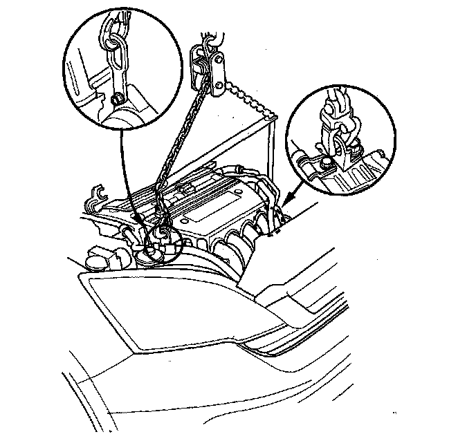 2. Raise the vehicle on the lift, and position the engine transmission assembly under the vehicle. Lower the vehicle, and attach the special tool and chain hoist to the engine, then lift the engine into position in the vehicle.