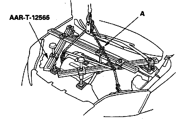 5. Install the engine support hanger (AAR-T-12566), then attach the hook to the slotted hole in the hanger adapter. Tighten the wing nut (A) by hand to lift and support the engine transmission assembly.