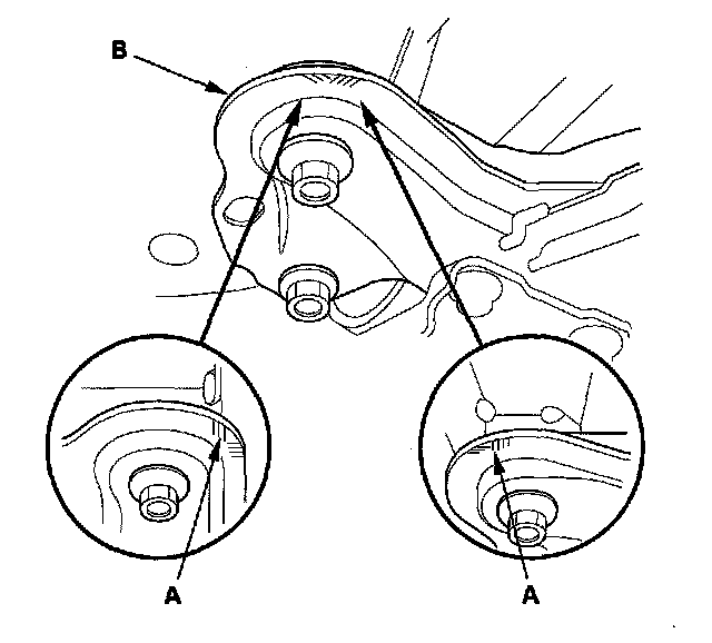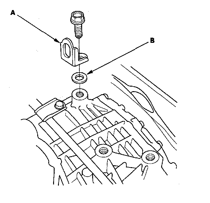 10. Remove the transmission hanger bracket (P/N 21232-RCT-A00) (A) and washer (B).