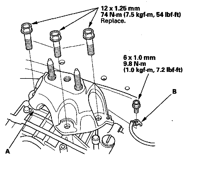 12. Install the transmission mount, then tighten the transmission mount stiffener mounting bolts (A) and the new transmission mount mounting bolts (B).