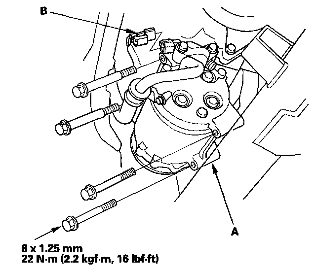 24. Install the A/C compressor (A), then connect the NC compressor clutch connector (B).