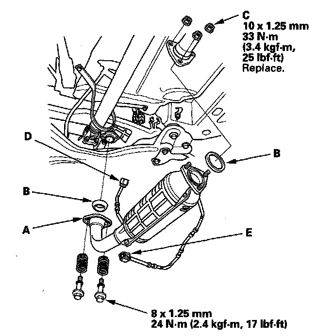 32. Install the three-way catalytic converter (TWC) (A). Use new gaskets (B) and new self-locking nuts (C).