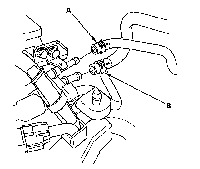 42. Install the evaporative emission (EVAP) canister hose (A) and brake booster vacuum hose (B).