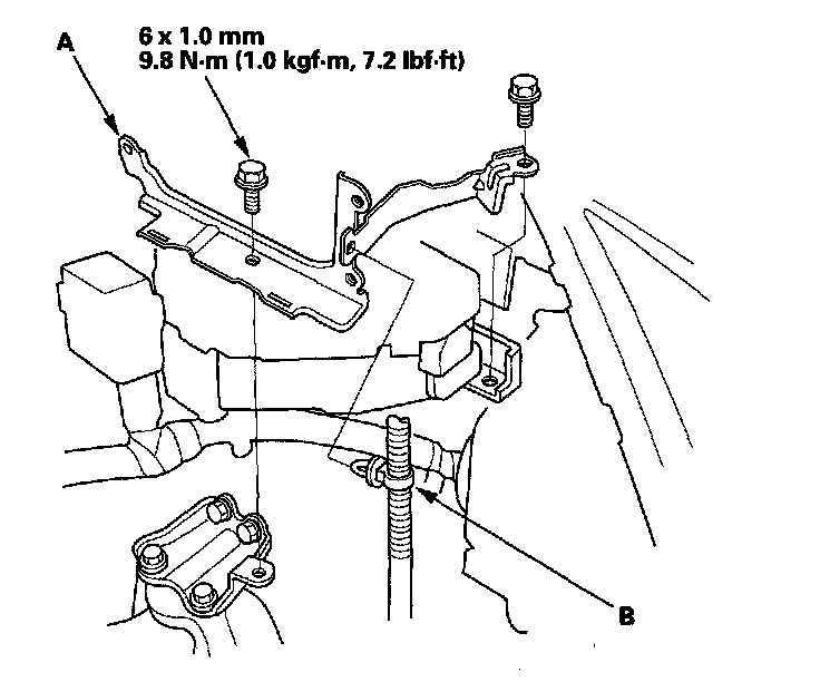 11. Install the transmission mount bracket (A), then install the ground cable (B).