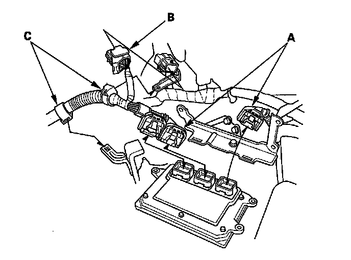 44. Connect the PCM connectors (A) and engine wire harness connector (B).