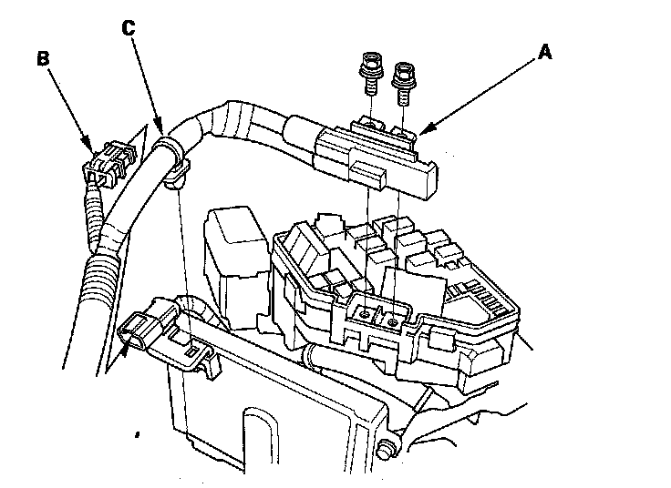 48. Connect the harness connector (B), and install the harness clamp (C).