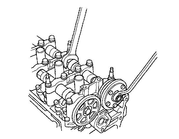 2. Hold the camshaft with an open-end wrench, then loosen the variable valve timing control (VTC) actuator mounting bolt and exhaust camshaft sprocket mounting bolt.