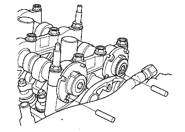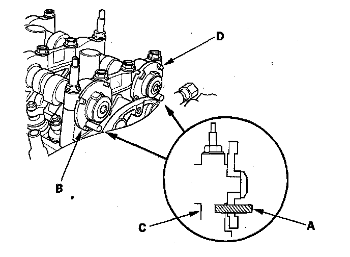 4. To hold the exhaust camshaft, insert a change detent arm shaft (P/N 24635-P6H-003) (A) into the maintenance hole in the CMP pulse plate B (D) and through No. 5 rocker shaft holder (C).