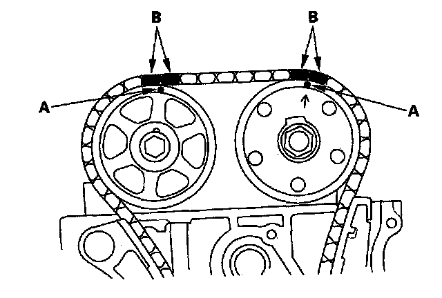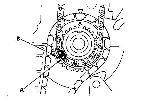 1. Set the crankshaft to top dead center (TDC). Align the TDC mark (A) on the crankshaft sprocket with the pointer (B) on the engine block.