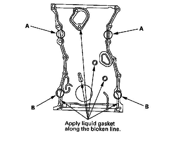 16. Apply liquid gasket to the engine block upper surface contact areas (A) on the chain case and lower block upper surface contact areas (B) on the chain case.
