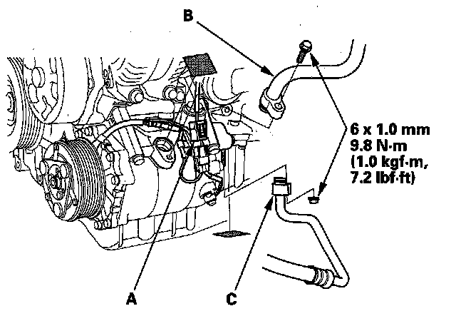 5. Disconnect the A/C compressor clutch connector (A). Remove the bolt and the nut, then disconnect the suction hose (B) and discharge hose (C) from the A/C compressor. Plug or cap the lines immediately after disconnecting them to avoid moisture and dust contamination.
