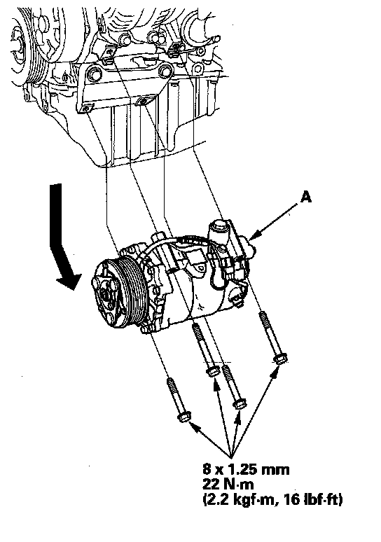 6. Remove the mounting bolts and the A/C compressor (A). Be careful not to damage the radiator fins when removing the A/C compressor.