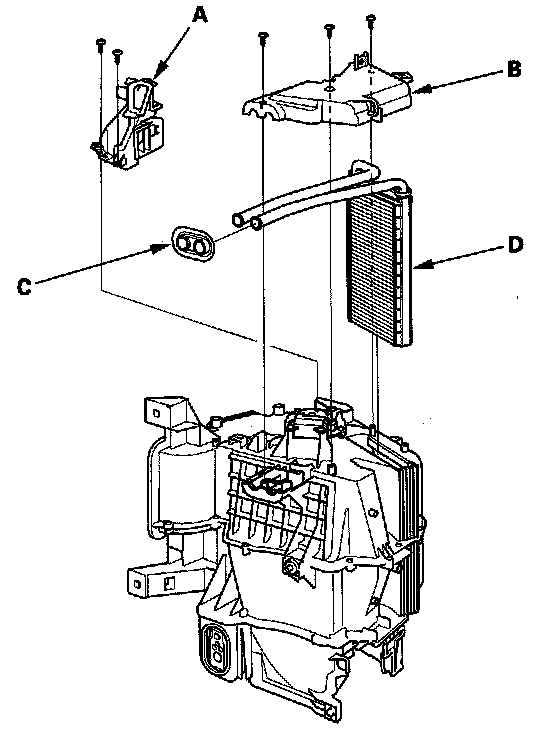 13. Remove the self-tapping screws and the driver's duct (A). Remove the self-tapping screws, the heater core cover (B), the grommet (C), and carefully pull out the heater core (D).