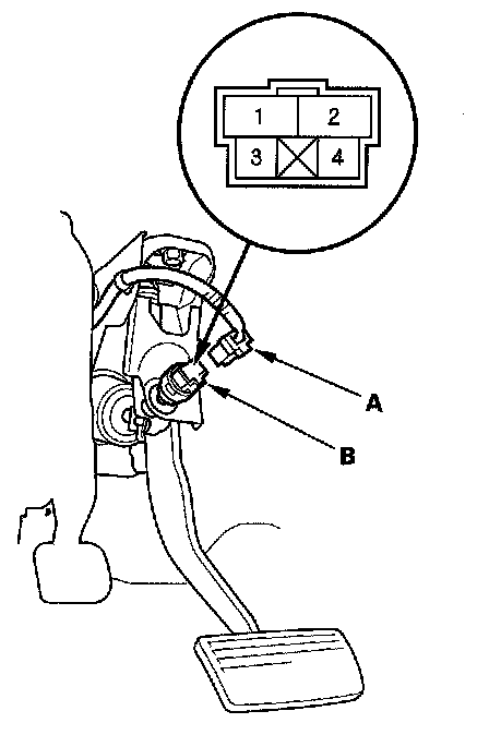 Brake Pedal Position Switch Test1. Disconnect the 4P connector (A) from the brake pedal position switch (B).