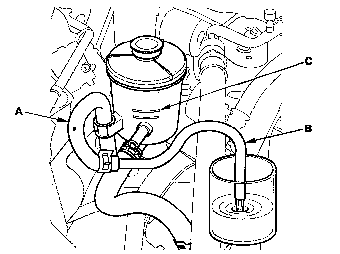 3. Start the engine, let it run at idle, and turn the steering wheel from lock-to-lock several times. When fluid stops running out of the hose, shut off the engine. Discard the fluid.