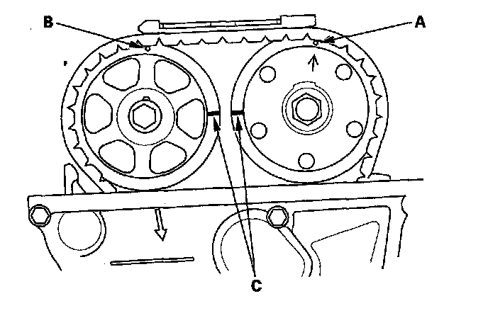 2. Set the No. 1 piston at top dead center (TDC). The punch mark (A) on the variable valve timing control (VTC) actuator and the punch mark (B) on the exhaust camshaft sprocket should be at the top. Align the TDC marks (C) on the VTC actuator and exhaust camshaft sprocket.