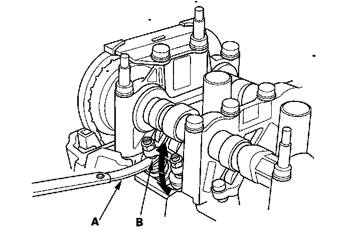 4. Insert the feeler gauge (A) between the adjusting screw (B) and the end of the valve stem, and slide it back and forth; you should feel a slight amount of drag.