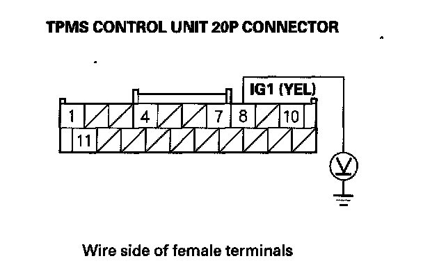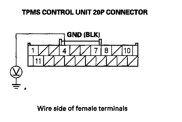 7. Measure voltage between body ground and TPMS control unit 20P connector terminal No. 10.