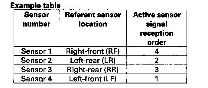 NOTE: An example is shown. The sensor signals are received by the TPMS control unit in this order; sensor 1-fourth, sensor 2-second, sensor 3-third, and sensor 4-first.