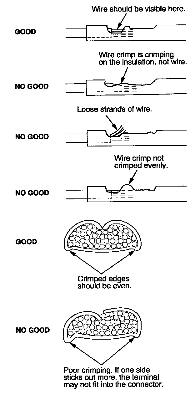 8. Inspect the quality of the wire crimp. If it has any of the following NO GOOD crimps, cut it off and start over.