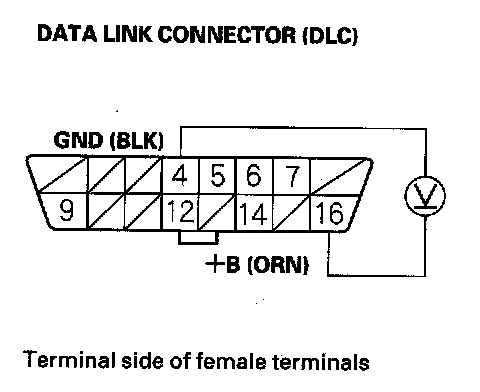25. Measure voltage between DLC terminal No. 16 and body ground.