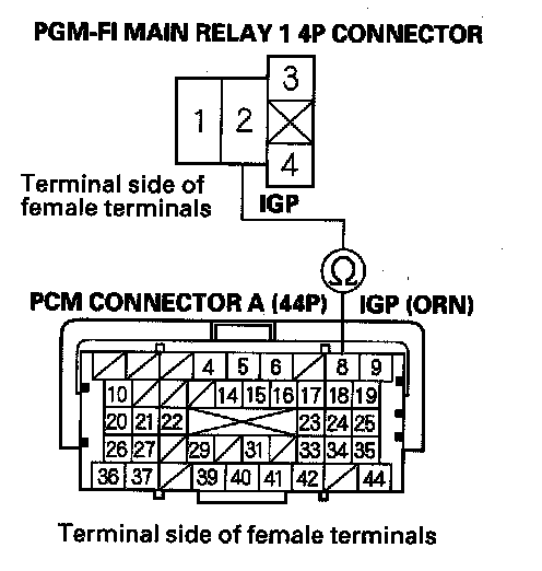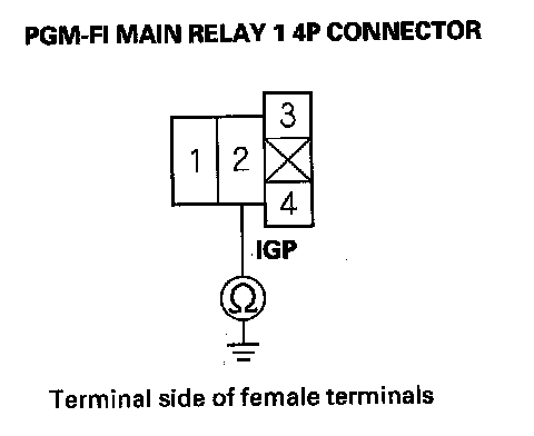 44. Check for continuity between PGM-FI main relay 1 4P connector terminal No. 2 and body ground.