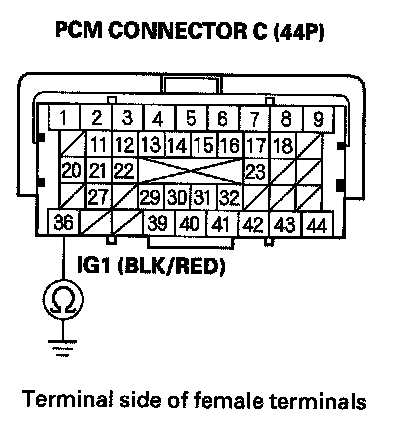 73. Check for continuity between body ground and PCM connector terminals B1, B36, C2, C40, and C44 individually.