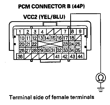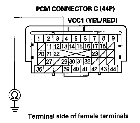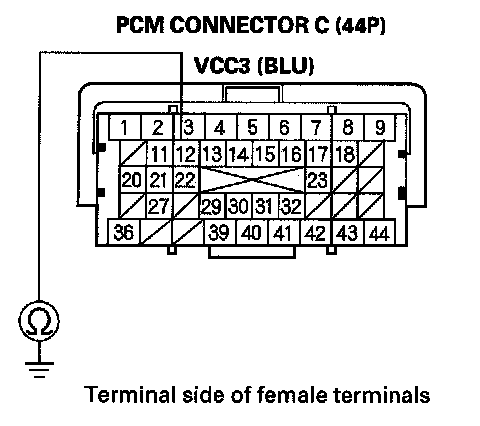 61. Measure voltage between PCM connector terminal C36 and body ground.