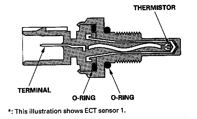ECT sensors 1 and 2 are temperature dependent resistors (thermistors). The resistance decreases as the engine coolant temperature increases.