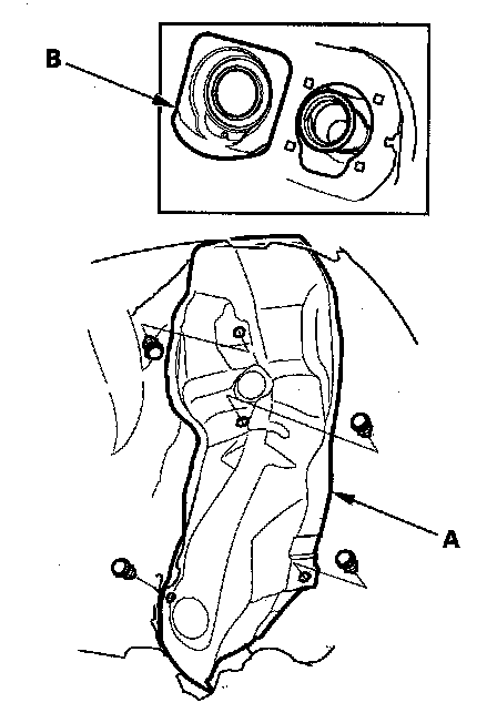 4. Remove the fuel fill pipe cover (A) and the fuel fill cap adapter (B).