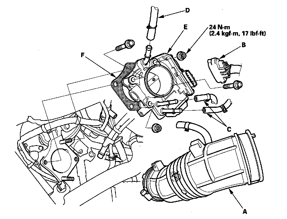 8. Remove the throttle body (E).