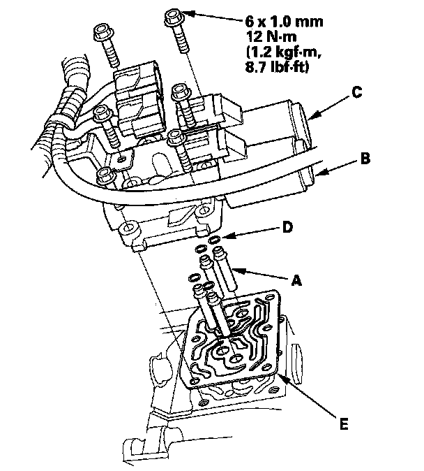 11. Remove the ATF joint pipes (A), O-rings (D), and gasket (E).