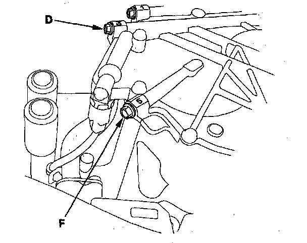 18. Connect the oil pressure gauge to the 3rd clutch pressure inspection port (D) and the 5th clutch pressure inspection port (F).