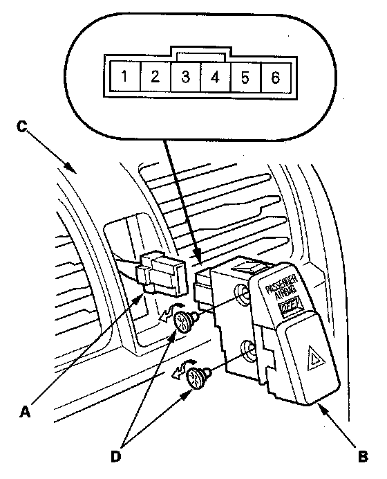 2. Disconnect the 6P connector (A) from the passenger's airbag cutoff indicator (B).