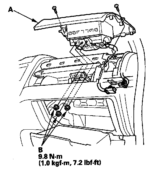 1. Place the new front passenger's airbag (A) into the dashboard. Tighten the front passenger's airbag mounting nuts (B).