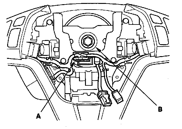 4. Disconnect the connector (A) from the cable reel, then remove the steering wheel bolt (B).