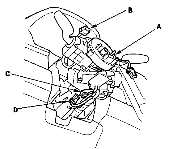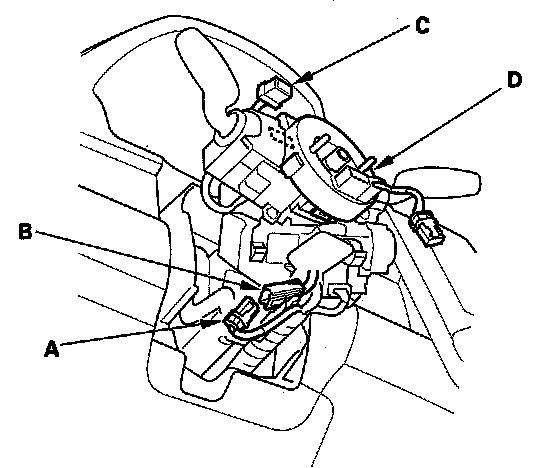 8. Disconnect the dashboard wire harness 4P connector (A) from the cable reel 4P connector (B), then disconnect the dashboard wire harness 13P or 5P connector (C) from the cable reel (D).