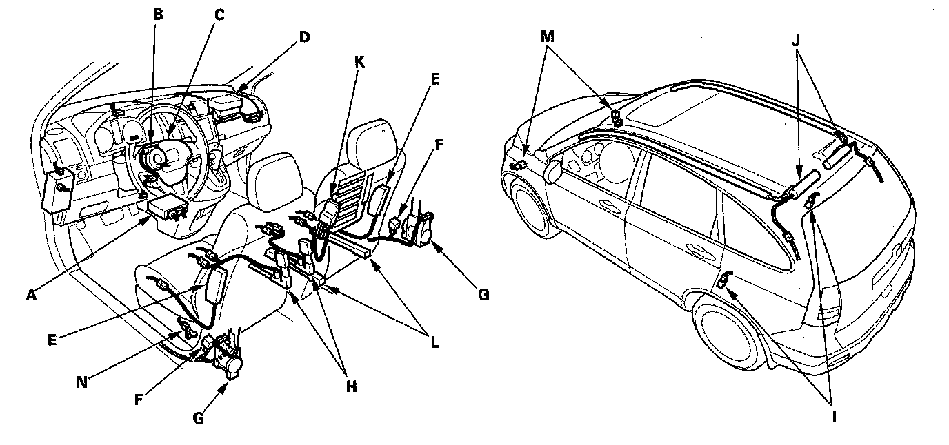 The SRS is a safety device which, when used with the seat belt, is designed to help protect the driver and front passenger in a frontal impact exceeding a certain set limit. The system consists of the SRS unit, including safing sensor and impact sensor (A), the cable reel (B), the driver's airbag (C), the front passenger's airbag (D), side airbags (E), side curtain airbags (J), seat belt tensioners (G), seat belt buckle tensioners (H), side impact sensors (first) (F), front impact sensors (M) and side impact sensors (second) (I).