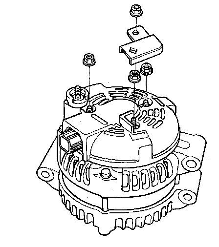 4. Remove the harness stay and the three flange nuts from the alternator.