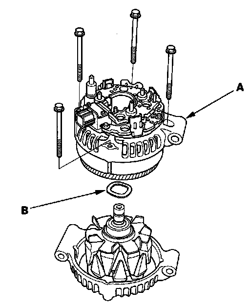 7. Remove the four bolts, then remove the rear housing assembly (A), and washer (B).