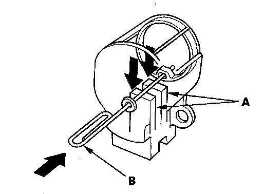 19. Push the brushes (A) in, then insert a pin or drill bit (B) (about 1.6 mm (0.06 in.) diameter) to hold them there.