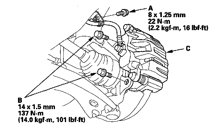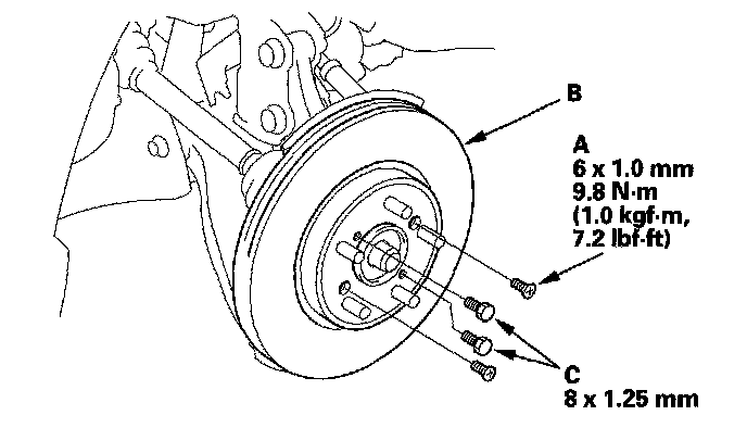 NOTE: If the brake disc has clung to the hub, screw two 8 x 1.25 mm bolts (C) into the brake disc to push it away from the hub. Turn each bolt 90 degrees to prevent the brake disc from binding.
