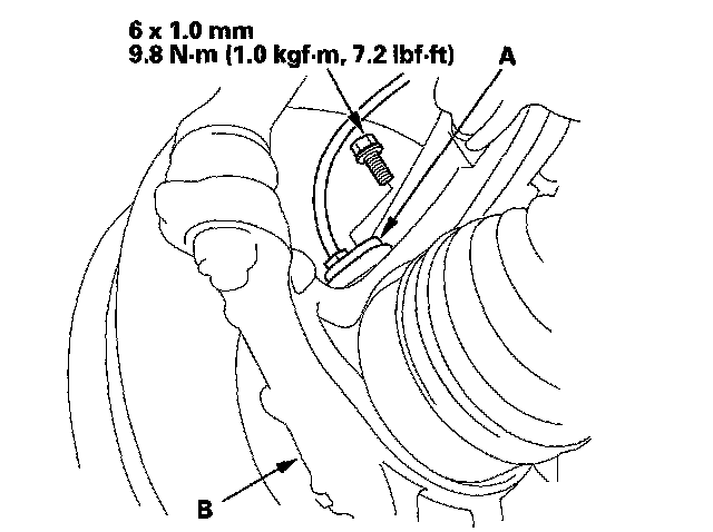 5. Remove the wheel sensor (A) from the knuckle (B). Do not disconnect the wheel sensor connector.