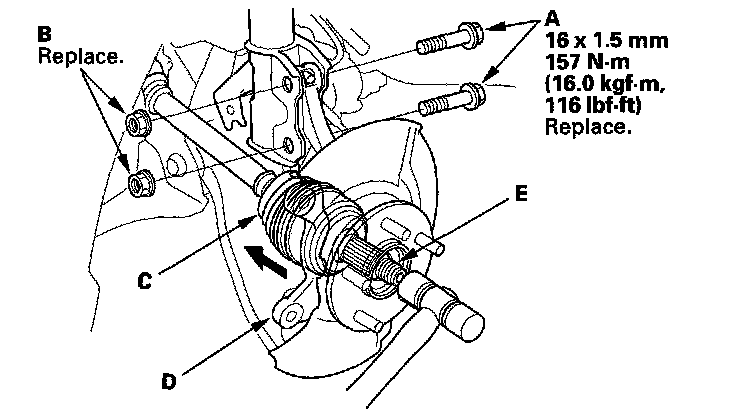 15. Remove the driveshaft outboard joint (C) from the knuckle (D) by tapping the driveshaft end (E) with a plastic hammer while drawing the hub outward, then remove the knuckle.